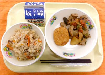 今日は、鳥取県の郷土料理の「どんどろけめし」、広島県の郷土料理の「はっすん」を取り入れました。「どんどろけめし」は、豆腐を入れた炊き込みご飯で、「はっすん」は、山の幸と海の幸を組み合わせて作られた煮物です。また、もう1つのおかずの「オニポテコロッケ」は、オニオンとポテトを使ったコロッケです。