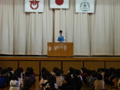1年生代表児童の挨拶があり、全校児童の前で、堂々と話すことができました。