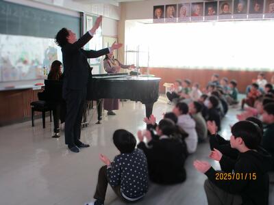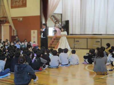 芸術鑑賞会では、バリトン歌手の安田旺司様、ソプラノ歌手の舘野真由花様、ピアニストの野原舞花様が来校され、15日には中学年、16日には低学年が体育館でコンサートを鑑賞しました。