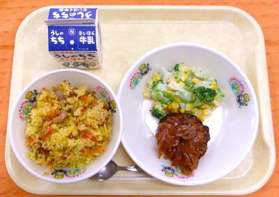 今日の「しゃくし菜とドライトマトの炊き込みご飯」は、埼玉県の秩父地方の特産品であるしゃくし菜と、セミドライトマトを合わせたご飯です。セミドライトマトは、ドライトマトよりもやや水分の残ったもので、風味や旨味をより強く感じられます。炊くときに、少量のカレー粉とターメリックを使用したので、彩りも鮮やかに仕上がります。