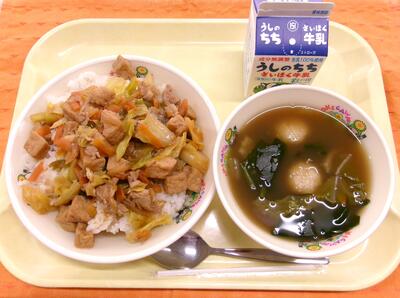 3学期の最初の給食なので、配膳しやすく食べやすいようにと、丼ぶりの献立にしました。みその味付けと野菜の甘味が厚揚げに染みていて、「おいしい!」の声をたくさん聞きました。3学期の給食もモリモリ食べてくださいね!