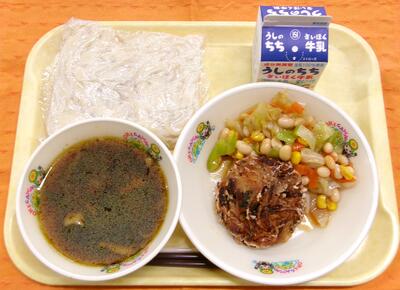今日は、かき揚げを組み合わせたうどんです。このかき揚げは、5種類の食材を使って、米粉で作られています。給食室で、サクサクになるよう揚げて、提供しました。そのまま食べたり、うどんの汁につけたりと様々な食べ方ができます。