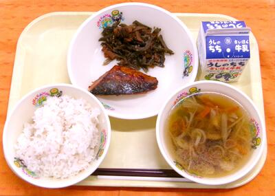 今日は、19日の食育の日にちなんだ献立で「和食」をテーマにしています。かつお節から出汁をとり、沢煮椀ときんぴらの両方に使用しています。沢煮椀は、かつお出汁に千切りにした野菜を入れて煮たので、甘味がでています。少量の塩・しょう油で味付けした旨味たっぷりの汁です。