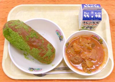 今日は、6年生のリクエストで1位になった揚げパンです。その中でも抹茶味が1番多かったので、「まっちゃ揚げパン」として提供しました。鮮やかな緑色と、トマト煮のオレンジ色が、春の色のようで、見た目にも季節を感じられる献立となりました。