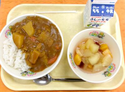 また、フルーツポンチは、6年生のリクエストです。桃やパイン等のフルーツとブドウゼリーが入っています。