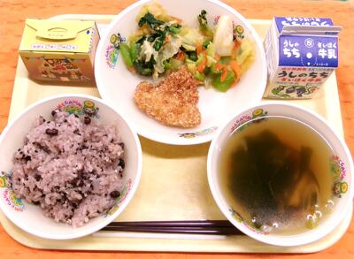 今日は、今年度最後の給食です。日本のお祝い時に親しまれている”赤飯”やチョコケーキを取り入れ、6年生の卒業と在校生の進級を祝っています。今回は、ささげの変わりに小豆を使って赤飯を炊きました。小豆の皮が裂けないように調理員さんが上手に炊いてくれて、きれいな赤色に仕上がりました。
