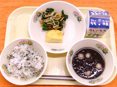 今日は、11日「鏡開き」と15日「小正月」を意識して白玉ぜんざいを取り入れました。給食室では、朝から小豆を戻し、一度茹でこぼしして、柔らかくなるまで煮ました。小豆の皮が破れないようにする事がコツで、調理員さんが上手に煮てくれました。教室では、お餅に見立てた白玉団子が、大人気でした。